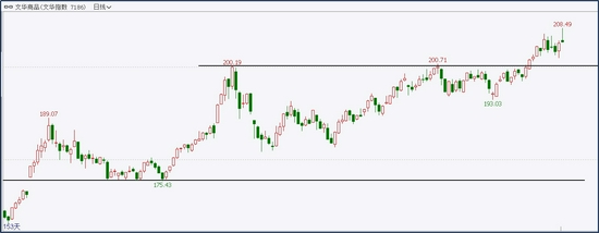【分析】国内商品指数正式站上前高200大关,步入多头结构。关注多头结构的持续性。后市如遇调整,200关口作为下方支撑位参考。