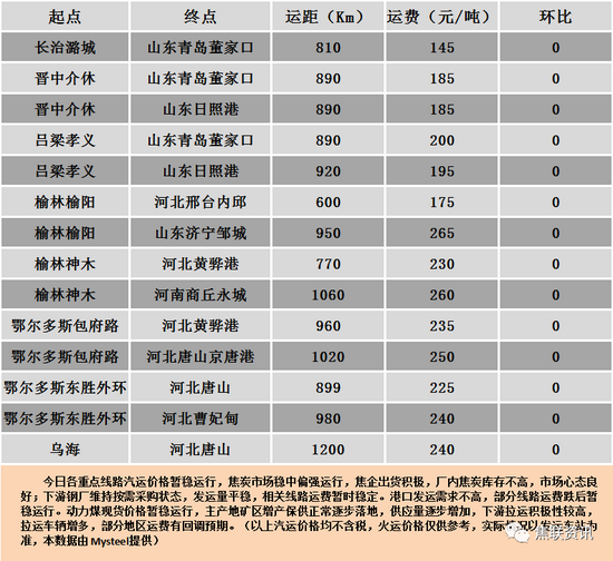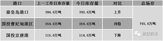 秦皇岛港铁路调入43.6万吨,装船35.6万吨,场存392.0万吨,锚地煤炭船舶30艘,预到31艘;国投曹妃甸港铁路调入15.1万吨,装船15.1万吨,场存259.0万吨,锚地煤炭船舶15艘,预到15艘;国投京唐港铁路调入14.3万吨,装船15.3万吨,场存114万吨,锚地煤炭船舶15艘,预到1艘。