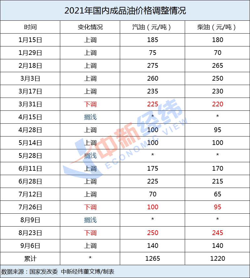 据中新经纬梳理,今年以来,国内成品油价格已进行了十七轮调整,呈现“十一涨三跌三搁浅”的格局,汽油价格累计上调了1265元/吨,柴油价格累计上调了1220元/吨。如果本轮上调预期兑现,将为年内油价第十二次上调。