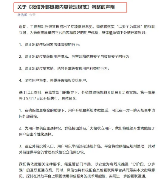 微信在发布的关于《微信外部链接内容管理规范》调整的声明中称,微信将落实“以安全为底线”的互联互通,为确保高质量的平台内容和良好的用户体验,整体遵循如下外链开放原则: