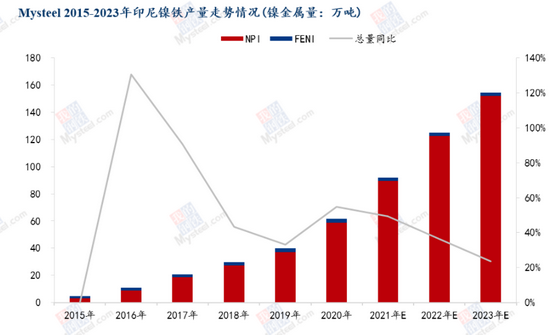 据Mysteel调研统计,截至2021年8月底,印尼正在生产的火法生产线合计115条,镍金属总产能126万吨。2020年印尼同比增加34条镍铁产线,2021年1-8月新增23条,预计全年新增43条产线(2022年43条,2023年33条)。2021年印尼镍铁(含NPI、FENI)镍金属产量将进一步提升至91.8万吨,同比增加49%;其中NPI为89.2万吨。