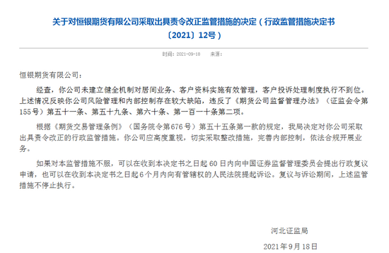 9月18日,河北证监局公布了一则行政监管措施决定书,恒银期货因相关违规遭责令改正。