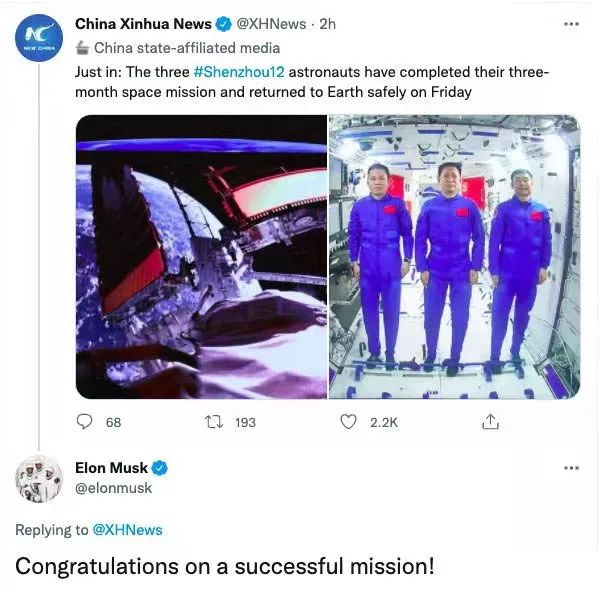 老板马斯克也不忘在推特祝贺“神舟十二号”和太空的蜜月之旅结束。