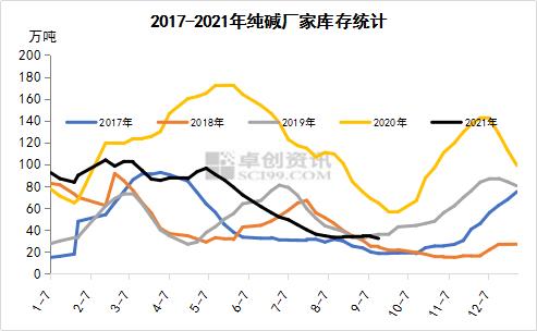 6-8月份是传统的检修旺季,纯碱厂家平均开工负荷在78.4%。进入9月份,部分前期检修厂家逐步开车运行,但江苏省纯碱厂家开工负荷再度下调,当地三家纯碱生产企业停产,导致纯碱行业开工负荷不升反降,预计9月份纯碱行业整体开工负荷在76.8%。而2017-2020年9月份纯碱厂家平均开工负荷在81.8%,2021年9月份开工负荷明显低于往年同期正常水平。纯碱厂家开工负荷不足,导致货源供应减量。