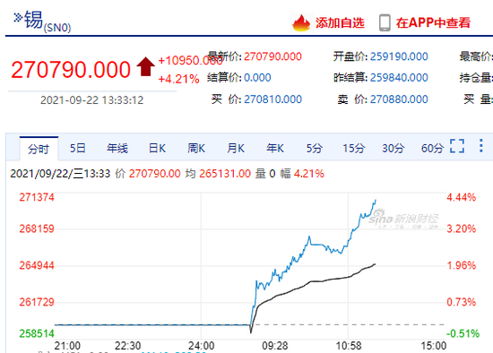9月22日,沪锡主力合约日内涨超4%,现报270790元/吨。