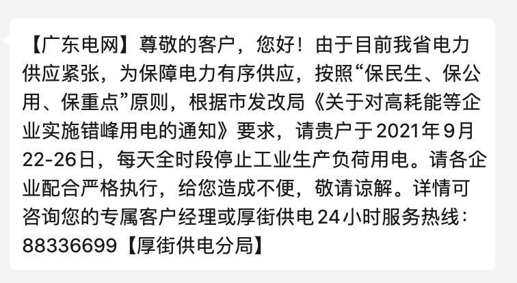 9月22日,吴德光收到广东电网东莞供电局厚街供电分局的一则短信通知,“由于目前我省电力供应紧张,为保障电力有序供应,按照‘保民生、保公用、保重点’原则,根据市发改局《关于对高耗能等企业实施错峰用电的通知》要求,请贵户于2021年9月22-26日,每天全时段停止工业生产负荷用电。”