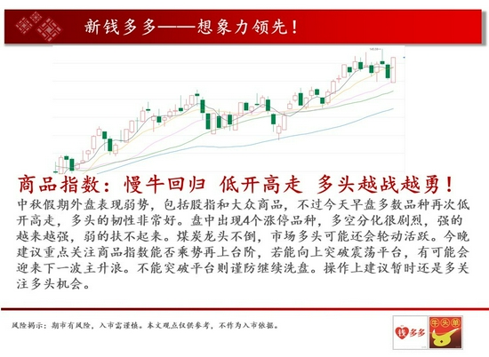 操作建议:中秋假期外盘表现弱势,包括股指和大众商品,不过今天早盘多数品种再次低开高走,多头的韧性非常好。盘中出现4个涨停品种,多空分化很剧烈,强的越来越强,弱的扶不起来。煤炭龙头不倒,市场多头可能还会轮动活跃。今晚建议重点关注商品指数能否乘势再上台阶,若能向上突破震荡平台,有可能会迎来下一波主升浪。不能突破平台则谨防继续洗盘。操作上建议暂时还是多关注多头机会。
