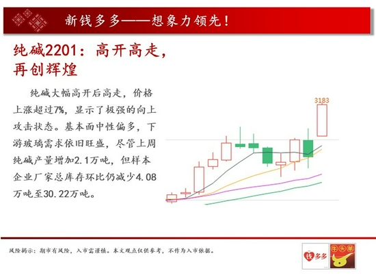 操作建议:纯碱大幅高开后高走,价格上涨超过7%,显示了极强的向上攻击状态。
