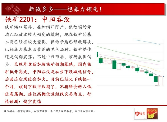 操作建议:虽然外盘新加坡铁矿假期暴跌,国内铁矿低开高走,中阳吞没是初步下跌减速信号,后面追空风险会加大。目前已经又下跌快一个月,该到下跌中后期了,不排除会转入低位震荡期。建议高抛低吸短线交易为主。行情预测:偏空震荡。