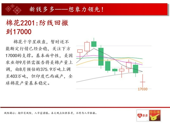 操作建议:棉花十字星收盘,暂时还不能断定行情已经企稳,关注下方17000的支撑。
