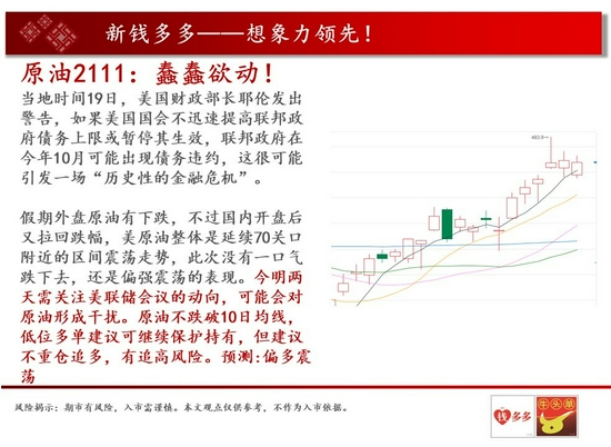 基本面概述:当地时间19日,美国财政部长耶伦发出警告,如果美国国会不迅速提高联邦政府债务上限或暂停其生效,联邦政府在今年10月可能出现债务违约,这很可能引发一场“历史性的金融危机”。假期外盘原油有下跌,不过国内开盘后又拉回跌幅,美原油整体是延续70关口附近的区间震荡走势,此次没有一口气跌下去,还是偏强震荡的表现。。
