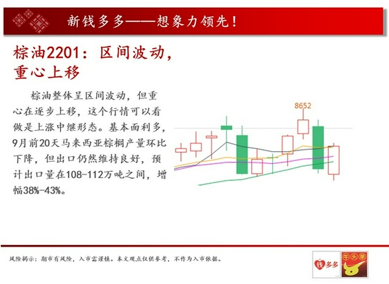 基本面概述:基本面利多,9月前20天马来西亚棕榈产量环比下降,但出口仍然维持良好,预计出口量在108-112万吨之间,增幅38%-43%。