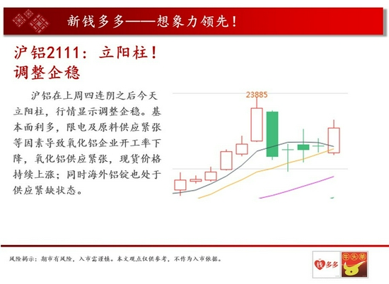 操作建议:沪铝在上周四连阴之后今天立阳柱,行情显示调整企稳。