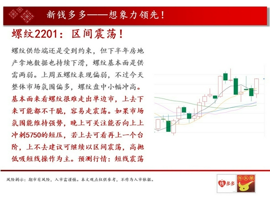 操作建议:基本面来看螺纹很难走出单边市,上去下来可能都不干脆,容易走震荡。如果市场氛围能维持强势,晚上可关注能否向上上冲刺5750的短压,若上去可看再上一个台阶,上不去建议可继续以区间震荡,高抛低吸短线操作为主。预测行情:短线震荡。