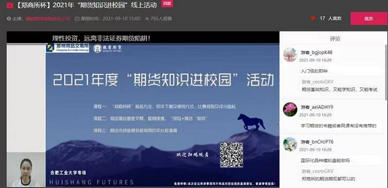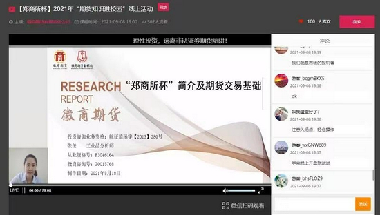2021年9月13日,徽商期货公司在三所高校成功举办第一场“期货知识进校园”暨第四届“郑商所杯”大学生模拟交易大赛宣讲会。中国科学技术大学管理学院MF中心副主任苟小菊、合肥工业大学经济学院MF中心主任张根文、重庆资源与环境保护职业学院教师王世忠参加本次宣讲会,徽商期货研究所李红霞、张玺、刘娇、王琪唯共同参与此次活动,并为在线观看直播的600余位学生进行了专题知识分享。