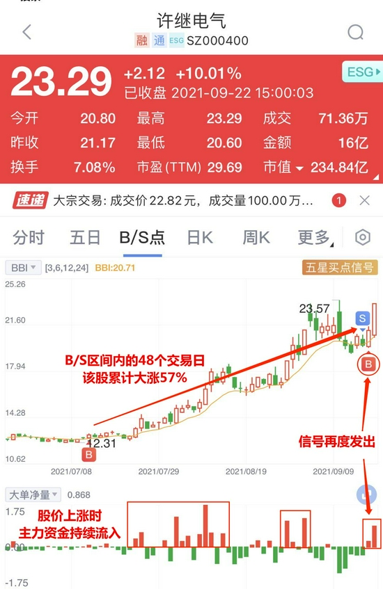 以今日大涨的股许继电气为例,通过新浪财经Level-2的大单净量发现,此前,在该股在拉升的同时,B/S点发出关键信号,并伴随着主力资金的持续流入,在B/S区间内的48个交易日里该股大涨了57%!而近期,B/S点也再度发出机会信号,主力也再度大幅流入该股,该股自B/S点信号发出后的至今的两个交易日里大涨了16%。
