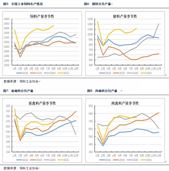 据饲料工业协会数据显示,8月份饲料总产量为2723万吨,环比增长6.5%,同比增幅在14.9%,1-8月累计饲料产量19212万吨,同比增幅19.1%。8月猪饲料产量1118万吨,环比增长6.9%,同比增加41.7%。今年,受疫情影响,道路封锁地区生猪出栏推迟,部分养殖户对后市仍存预期,压栏与顺势出栏现象同在,月内生猪出栏量有所减少,猪料环比增加。1-8月猪料累计同比增加62.6%,同比增幅相较于上月继续下滑,预计下半年在去年高基数情况下,同比增幅继续下滑,且上半年猪价的大幅下行,跌破大部分企业成本线,导致下半年养殖企业扩产速度有所放缓,猪料增幅也将放缓。此外,蛋禽料累计同比减少9.4%,肉禽料累计同比减少3.8%,水产料累计同比增加10.9%,随着产蛋鸡存栏及商品肉鸡存栏回升,禽料或将环比增加。