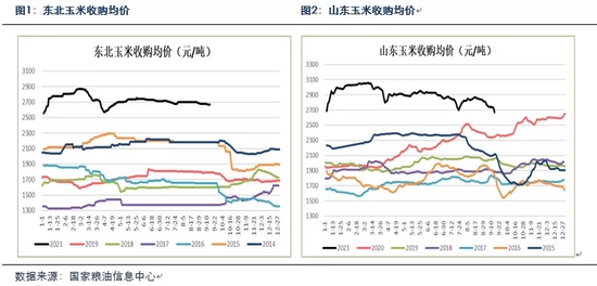 目前进入9月份,各主产区已陆续迎来新玉米大量上市。从率先迎来新玉米上市的山东南部和黑龙江东部玉米价格来看,当地现货价格明显弱于新玉米还未上市的地区。从季节性规律来看,山东玉米现货价格有望在9-10月见到阶段性底部,东北玉米现货价格一般在10-11月有望见到阶段性底部,实际上,这两个时间段基本也是其大量上市的时间段。今年在市场结转较多及收购意向低迷的情况下,预计现货见底的时间可能在传统见底时间的尾部,即山东可能到10月份有望见底,东北则在11月份才有望见底。