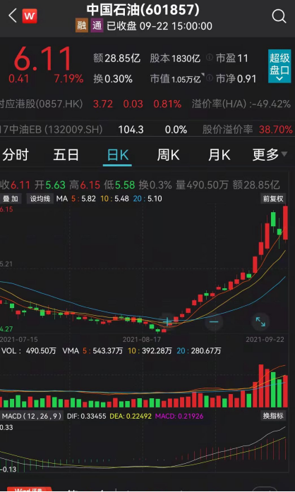 今日午后,中国石油强势拉升,截至收盘上涨7.19%收报6.11元,创逾两年来新高;当前市值1.05万亿元,已逼近宁德时代。事实上,自今年8月23日以来,中国石油便开启持续上涨模式,截至今日收盘,一个月时间已累计大涨43%。