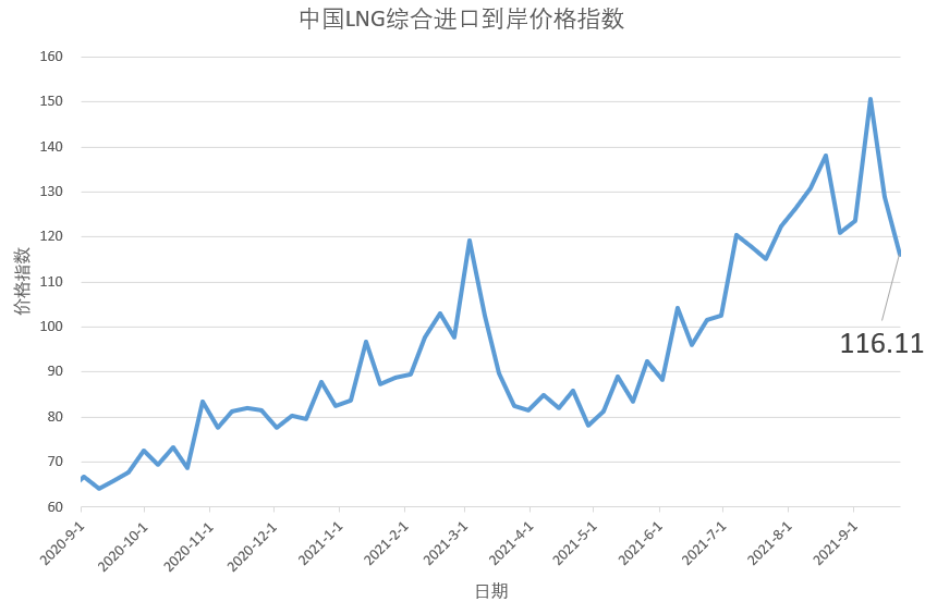 9月22日,海关总署全球贸易监测分析中心和上海石油天然气交易中心联合发布的中国LNG综合进口到岸价格指数显示,9月13日-19日,中国LNG综合进口到岸价格指数为116.11(C.I.F,不含税费、加工费),环比下调9.87%,同比上涨71.41%。
