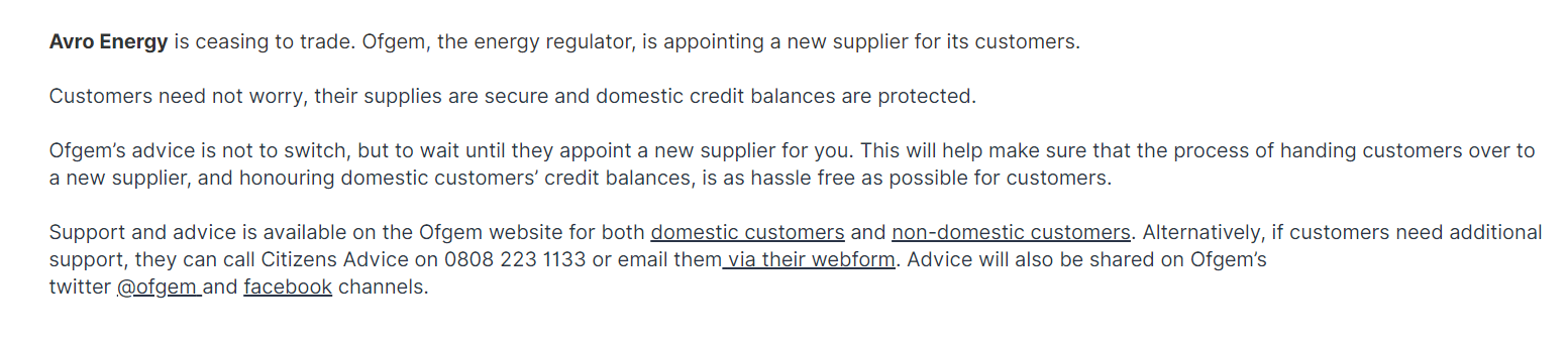 加上周三宣布停止服务的两家,自八月初开始累计已经有七家能源供应商退出市场,造成超过150万家庭需要寻找新的供应商。据悉,Avro和Green Supplier分别有有58万和25.5万用户,大约占英国家庭总数的2.9%,另外五家倒在天然气和能源价格创历史新高过程中的供应商总共有65万用户。