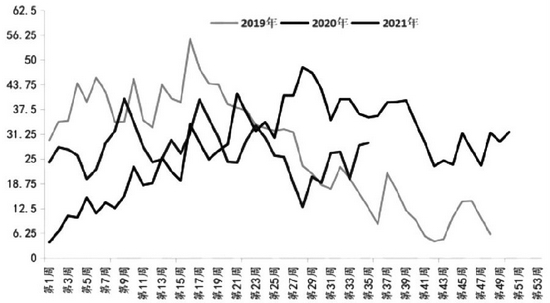 从需求端来看,目前气温依旧偏高,水产养殖仍处于旺季,主要用于水产饲料生产的菜粕需求较为旺盛。据中国饲料工业协会统计,2021年8月,全国工业饲料总产量为2723万吨,环比增长6.5%,同比增长14.9%。其中,水产饲料产量382万吨,环比增长18.8%,同比增长19.0%。2021年1—8月,水产饲料产量为1628万吨,同比增长12.7%。