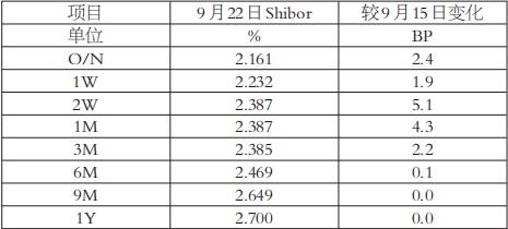 受中秋和国庆资金需求高峰到来的影响,本周国内市场利率整体呈现上升的态势。截至9月22日,上海银行间同业拆放利率(Shibor)隔夜、1周期、2周期、1月期、3月期、6月期利率分别报收于2.161%、2.232%、2.387%、2.387%、2.385%、2.469%,较9月15日分别上升2.4、1.9、5.1、4.3、2.2、0.1个基点;9月期、1年期利率分别报收于2.649%、2.7%,较9月15日持平。