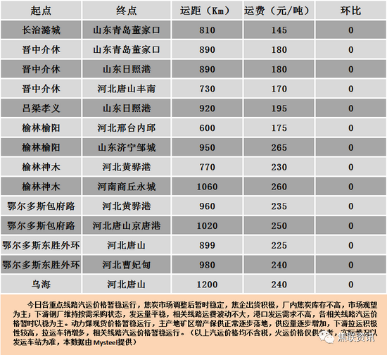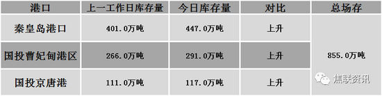 秦皇岛港铁路调入54.4万吨,装船34.4万吨,场存447.0万吨,锚地煤炭船舶50艘,预到35艘;国投曹妃甸港铁路调入20.1万吨,装船11.1万吨,场存291.0万吨,锚地煤炭船舶26艘,预到6艘;国投京唐港铁路调入13.4万吨,装船16.4万吨,场存117.0万吨,锚地煤炭船舶16艘,预到1艘。