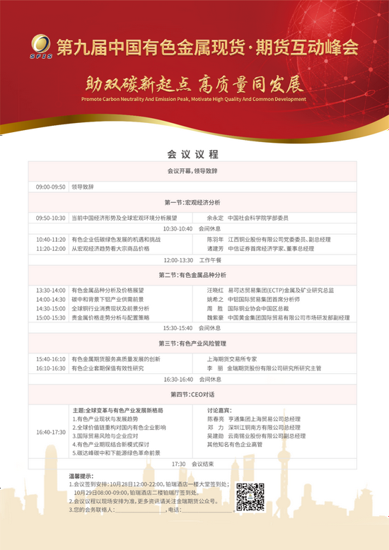 “中国有色金属现货·期货互动峰会”由江西铜业集团、上海期货交易所主办,金瑞期货股份有限公司承办,会议每两年一届,已成为推动中国有色金属产业与期货行业实现良好沟通、共享研究成果的重要平台。第九届峰会将于2021年10月29日在上海虹桥绿地铂瑞酒店铂瑞厅隆重举行,盛情邀请您拨冗出席。
