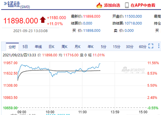 9月23日午后开盘,锰硅主力合约涨停,涨幅11.01%,报11898元/吨。