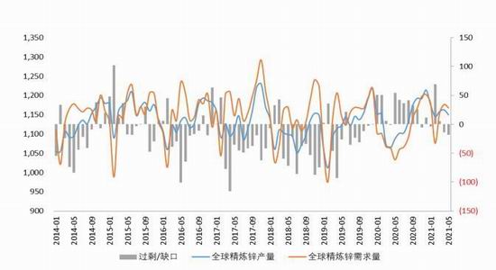 从锌锭供需情况来看,国际铅锌小组数据显示,全球5月精锌产量114.9万吨,消费量116.7万吨,供应短缺1.79万吨,5月全球锌市供需延续4月的短缺状态。目前海外国家精炼锌产量较为稳定,只有纳米比亚和加拿大产量出现下降,主要是受纳米比亚的Skorpion冶炼厂停产,以及泰克资源加拿大Trail冶炼厂检修等因素影响。而印度、秘鲁、美国等国内炼厂月内产量则有所增加。比如:美国的AZR冶炼厂在今年年中即将达产,印度Vedanta旗下炼厂也持续释放产量。需求方面,随着欧美疫苗覆盖率的持续提升,海外消费市场延续复苏回暖。并且在美国参议院努力推动万亿美元规模的基建支出计划情况下,美国国内需求有望继续增长。不过在Delta变异病毒引发的疫情风险再度上升之际,短期海外市场的消费信心有所回落。同时在美国政府或结束现金救助的情况下,美国居民消费恐有短期回落风险,全球精炼锌供需或再度出现过剩的局面。