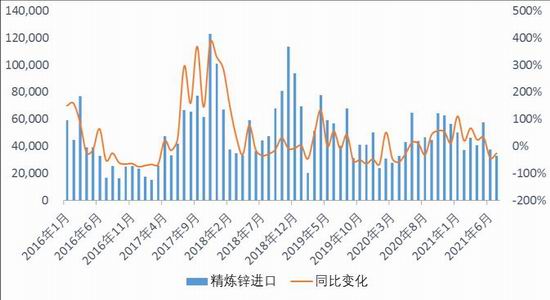 海关总署最新数据显示,2021年7月进口精炼锌3.27万吨,环比下降34.77%,同比下降42.05%,合计出口精炼锌0.07万吨,2021年7月净进口3.19万吨。2021年1-7月累计进口30.2万吨,同比上涨13.13%。8月陆续出炉的数据显示,美国7月CPI同比上涨5.4%,核心CPI继6月上涨0.9%之后,又上涨了0.3%。7月PPI较上年同期跃升7.8%,也创下2010年该数据推出以来的新高。同时美国上周首次申请失业救济人数已连续第四周下降,降至疫情暴发以来新低。在美国通胀和就业数据均已触及美联储标准的情况下,美联储主席鲍威尔或在8月的杰克逊霍尔会议上释放偏鹰信号。LME锌库存月内维持去库状态,LME0-3结构也向着Back方向逐渐扩大,在海外终端需求继续复苏的背景下,伦锌价格相对强势。国内方面,月内多地炼厂受电力供应问题,被迫压减产能运行,使得国内产量呈环比收缩态势。但国家粮食和物资储备局确认将继续执行抛储政策,或对冲供应收缩的减产预期。不过国内库存的绝对数量目前仍然较低,或令沪伦比值向上修复。整体来看,随着矿端供应矛盾的缓和,国内精锌月度供应呈逐步增加态势,或令进口窗口继续处在关闭状态,预计8月精炼锌进口量维持在4万吨左右的水平。