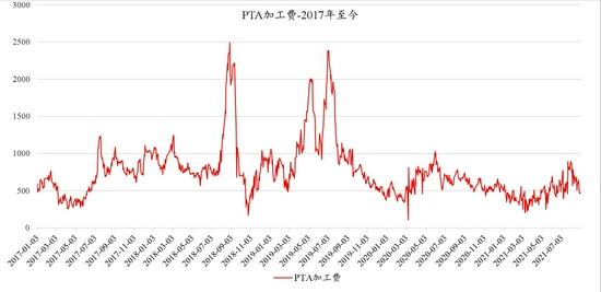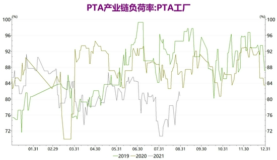 PX价格从8月初的956美元/吨,跌至8月31日的897美元/吨,累计下跌59美元/吨,折算成PTA的生产成本下降288元/吨。2021年以来,大部分时间内TA价格运行的逻辑主要是上游价格上涨的成本推动和PTA低加工费条件下的低开工,原油和PX价格走弱使得上游对PTA价格的支撑作用减弱。