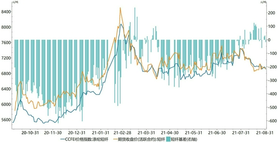 2021年以来,短纤价格除了在2月份曾经一度大幅上涨,其余时间长期趋弱。8月份,现货和期货价格大幅下挫,期货价格跌幅相对更大,短纤期货从上市以来持续高升水结构已经转变为期货贴水,期货高估值的情况发生了实质性的改变。