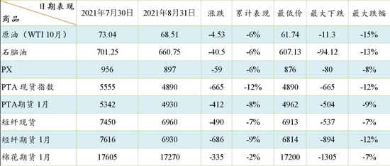 8月份聚酯产业链相关品种普遍累计下跌,国际原油价格一度跌幅较大,使得PTA失去成本支撑,尽管PTA在8月份继续去库存,但在上游原油和PX价格下跌、聚酯端因加工费较低开工下行,PTA方面的负反馈增多,8月份总体呈现持续下跌行情。短纤方面,7月底短纤工厂因亏损较大,出现降负挺价,由于下游趋弱,短纤工厂降负挺价的行为并未对价格带来有效支撑。