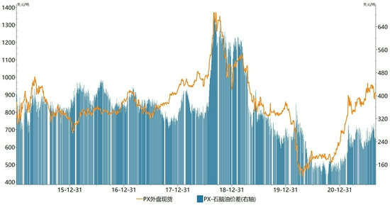 8月份,国内PX产能基数2933万吨/年,8月份开始浙石化二期1#250万吨/年的PX新装置记入产能基数。盛虹1600万吨炼油、280万吨PX炼化一体化项目,预计在2021年底建成投产,PX的供应将更加宽松。8月份,PX-石脑油价差在247-302之间窄幅运行,产能充足情况下,加工价差波动区间依然会维持较低水平,PX价格走势将会受到原油的价格影响,在预期原油上升空间有限的情况下,预计9月份PX价格上行空间不大。