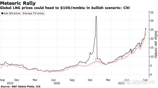 “未来几周和几个月,全球天然气价格可能会继续呈抛物线走势,”花旗分析师在报告中表示。“需求强劲和供应不足导致市场急剧收紧。任何意外的需求激增或供应中断都可能推动价格进一步上涨。”