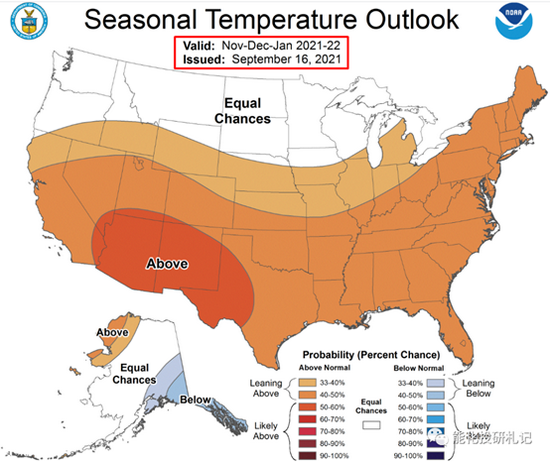 NOAA最新给出的预期是,今年冬季气温比往年平均略高的概率大(图4)。密切关注气温预测可能的变化。