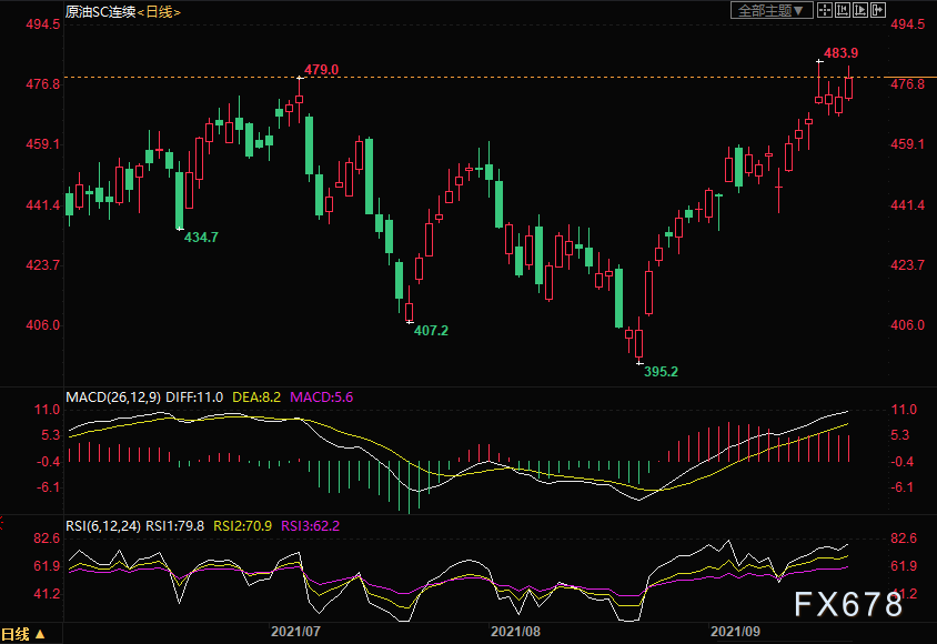 上海原油价格上涨,主力合约2111终盘收于479.4元/桶,涨7.8元/桶,涨幅1.65%。