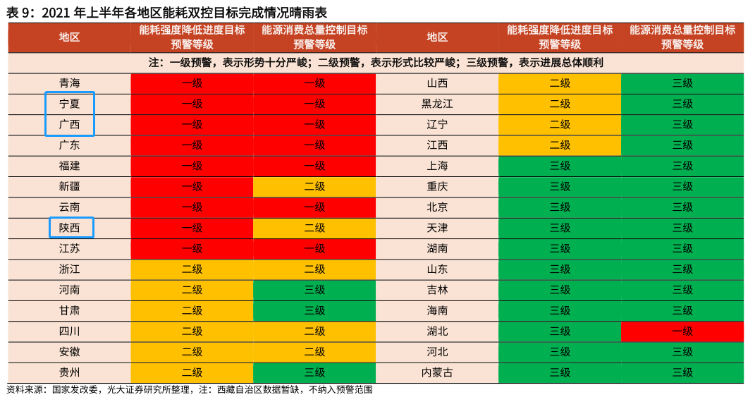 从各地区情况来看,青海、宁夏、广西、广东、福建、云南、江苏省(区)上半年能耗强度不降反升,为一级预警,双控目标完成情况较为严峻。