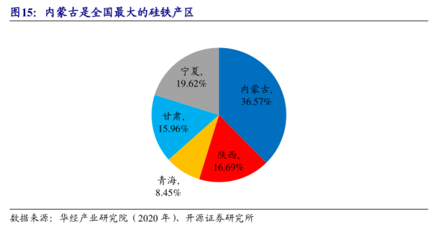 资料显示,目前全国硅铁产地主要有内蒙古、青海、陕西、宁夏,占比分别为36.6%、9.6%、16.7%和16.0%,在硅铁主产地内蒙古,鄂尔多斯占比六成,君正占比两成,其余产量由其他小厂贡献。