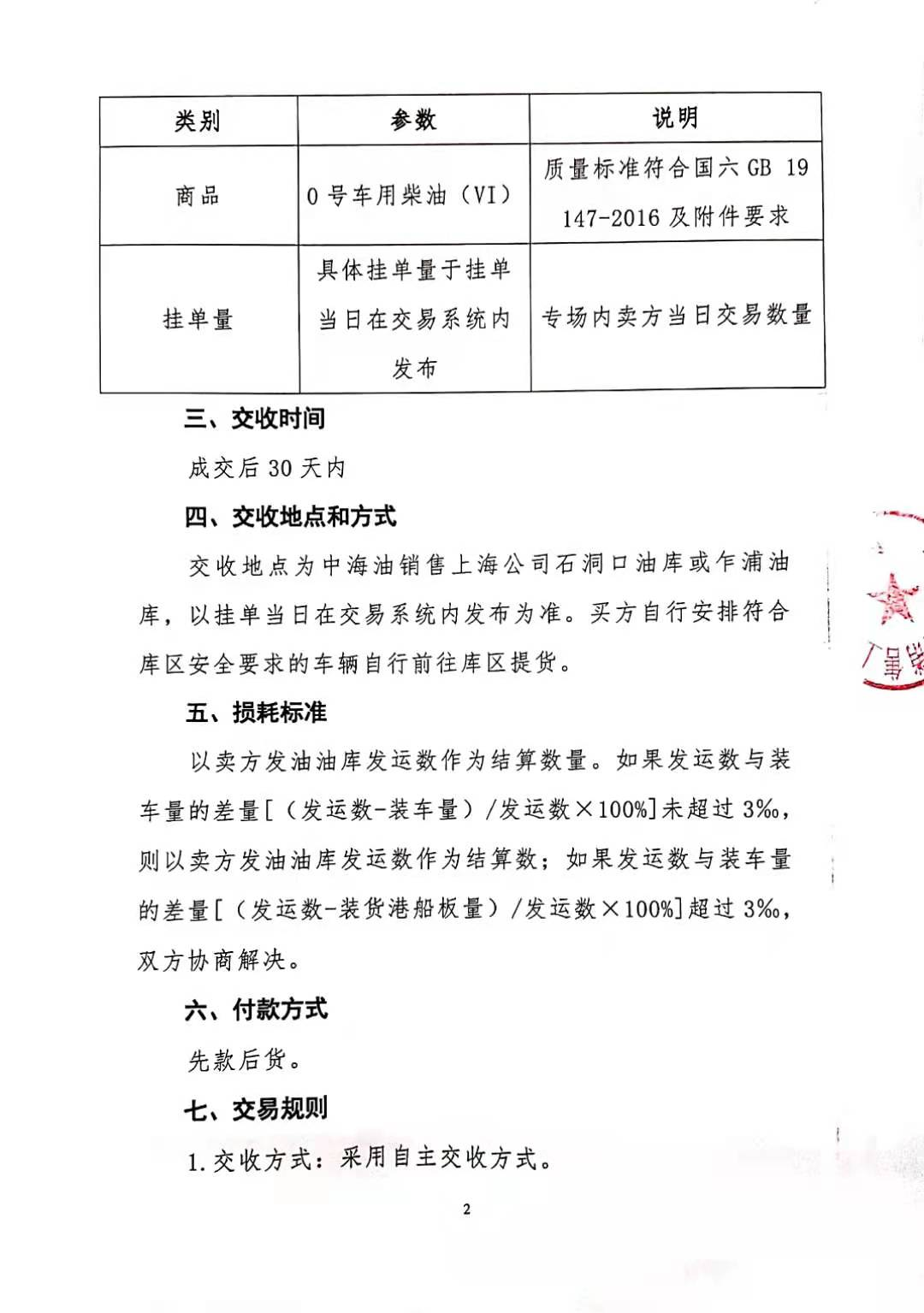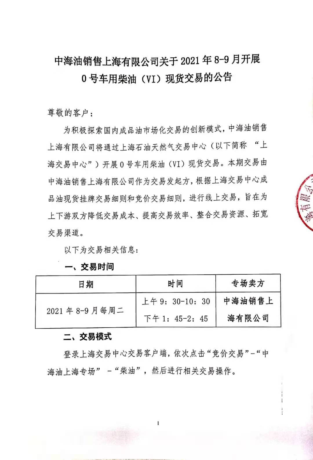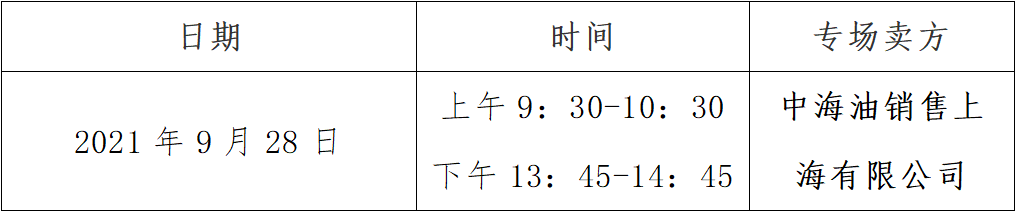 SHPGX导读:为降低上下游交易成本、提高交易效率、整合交易资源、拓宽交易渠道,中海油销售上海有限公司将于2021年8月-9月期间,每周二在上海石油天然气交易中心进行0号车用柴油(VI)专场交易,9月28日(周二)交易通知如下。