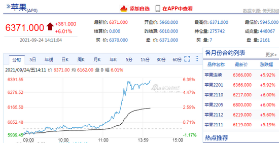 快讯:9月24日下午,苹果主力合约触及涨停,创该合约近3个月以来新高。当前报价6371元/吨,涨幅6.01%。