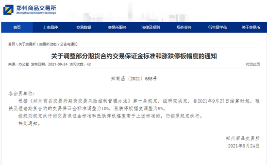 郑商所:经研究决定,自2021年9月27日结算时起,硅铁及锰硅期货合约的交易保证金标准调整为10%,涨跌停板幅度调整为9%。