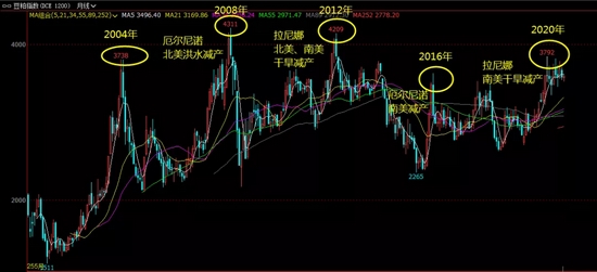天气方面,我们从豆粕指数的月线图上可直观观察出规律,即豆粕四年一周期。从2004年之后,但凡豆粕大涨的年份都有天气配合。巧的是,厄尔尼诺与拉尼娜现象平均每4年发生1次,厄尔尼诺与拉尼娜相互转变大约需要4年时间。与豆粕的每4年出现1次价格高点相吻合。2020/21年度的拉尼娜现象在5月份结束,因此完美避开了美豆的种植与生长阶段,虽然持续受干旱困扰,优良率不佳,但大规模的天气炒作并未发生。眼下南美巴西大豆陆续开始种植,拉尼娜现象似乎逐渐发酵。