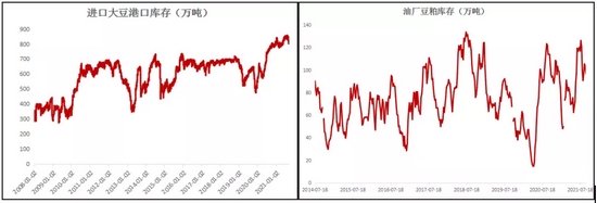中国的进口方面,1-8月份,中国累计进口6710万吨,是近十年同期最高位。在中美贸易协议的履行下,预计2021年的总进口量还将超过1亿万吨。目前大豆港口库存位于近年同期高位,豆粕库存处于持续去化过程中,但从绝对量上来说,由于油厂开机率维持在高位,豆粕库存属于相对高位。