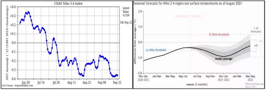 目前Nino3.4区域的海水温度已经再次接近拉尼娜临界值,根据NOAA的预测模型,今年冬天发生拉尼娜现象的概率为70%-80%,也就是说很有可能发生连续拉尼娜现象。而拉尼娜造成的最直接影响便是导致南美继续干旱。因此南美大豆单产可能受到威胁(主要是阿根廷)。四季度若针对南美大豆进行天气炒作,那么也将带动CBOT大豆价格进一步走高。