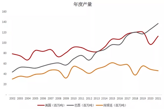 种植面积方面,整体来说,南美种植面积呈逐年上升态势,而美国播种面积在2017年达到巅峰之后,近几年略有下滑。2020-2021年在高价刺激下,种植面积有所增加,但在玉米种植的高度竞争下,仍未超过2017年的高峰。
