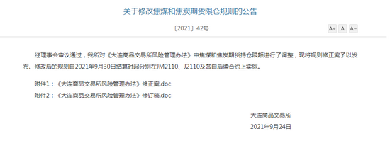 经理事会审议通过,我所对《大连商品交易所风险管理办法》中焦煤和焦炭期货持仓限额进行了调整,现将规则修正案予以发布。修改后的规则自2021年9月30日结算时起分别在JM2110、J2110及各自后续合约上实施。