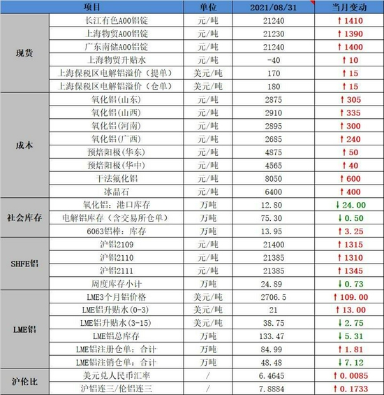 8月份,沪铝主力2110合约再度大涨,月度累计涨幅6.53%,收盘站上21000元/吨一线,创出近十三年以来新高;LME铝价当月上涨4.20%,连续第七个月上涨,最高突破2700美元/吨一线;沪伦比8月上升至7.89一线附近。现货方面,8月份长江有色A00铝锭累计上涨1410元/吨,截止8月底,现货维持小幅贴水状态。